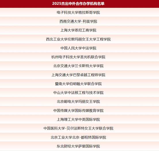 据中外合作办学联席会消息,为了总结和展示中外合作办学成效,引领和推动中外合作办学的高质量发展,中外合作办学联席会在评选2024中外合作办学机构优秀案例的基础上,于2025年上半年开展了全国中外合作办学机构评价工作。经过中外合作办学联席会专家委员会和主席团会议的多次讨论与最终通过,评出本年度中外合作办学机构杰出机构和优秀机构,杰出机构名单如下。