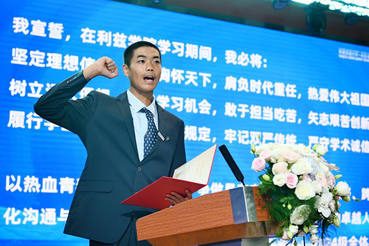 随后,新生集体宣誓环节将典礼推向了高潮。新生代表杨宝睿领誓,全体新生用坚定的声音表达了对理想信念的坚守、对时代重任的担当以及对学术诚信的承诺。