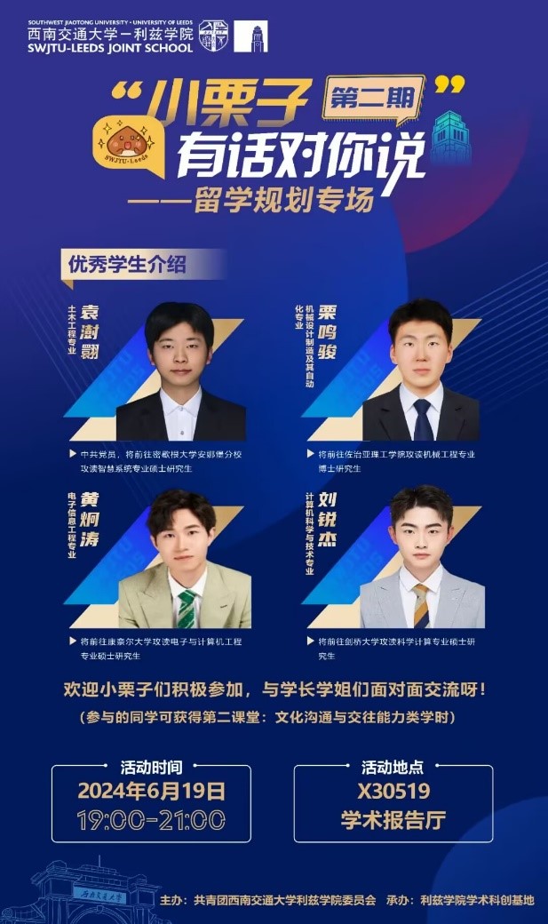 大学期间的竞赛科研该如何安排?学习深造或是就业选择的方向该如何确定?很多同学都曾有过这样的疑问与迷茫。为了帮助同学们更好地明确大学的学习计划、发展路径,伟德国际1949始于英国员工会邀请学院各届优秀员工,开展“‘小栗子’有话对你说”、“栗子WE来”等系列朋辈分享会,立足日常学习、科研竞赛、留学深造、个人成长等方面,分享自身经验、共享前沿信息,从朋辈视角回答同学关切的问题,为学院同学们的大学之路提供参考、指点迷津。