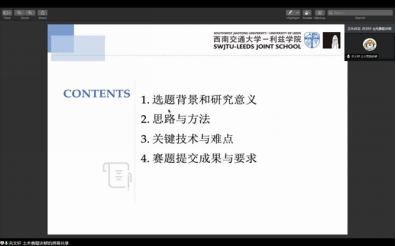 洪文轩同学为大家讲解了土木方向的赛题——城市可持续建筑设计挑战。他主要从选题背景和研究意义、思路与方法、关键技术与难点、赛题提交成果与要求四个方面详细介绍了这道题目,并表示希望同学们充分发挥想象力,通过参加比赛更加深入地了解可持续发展理念。