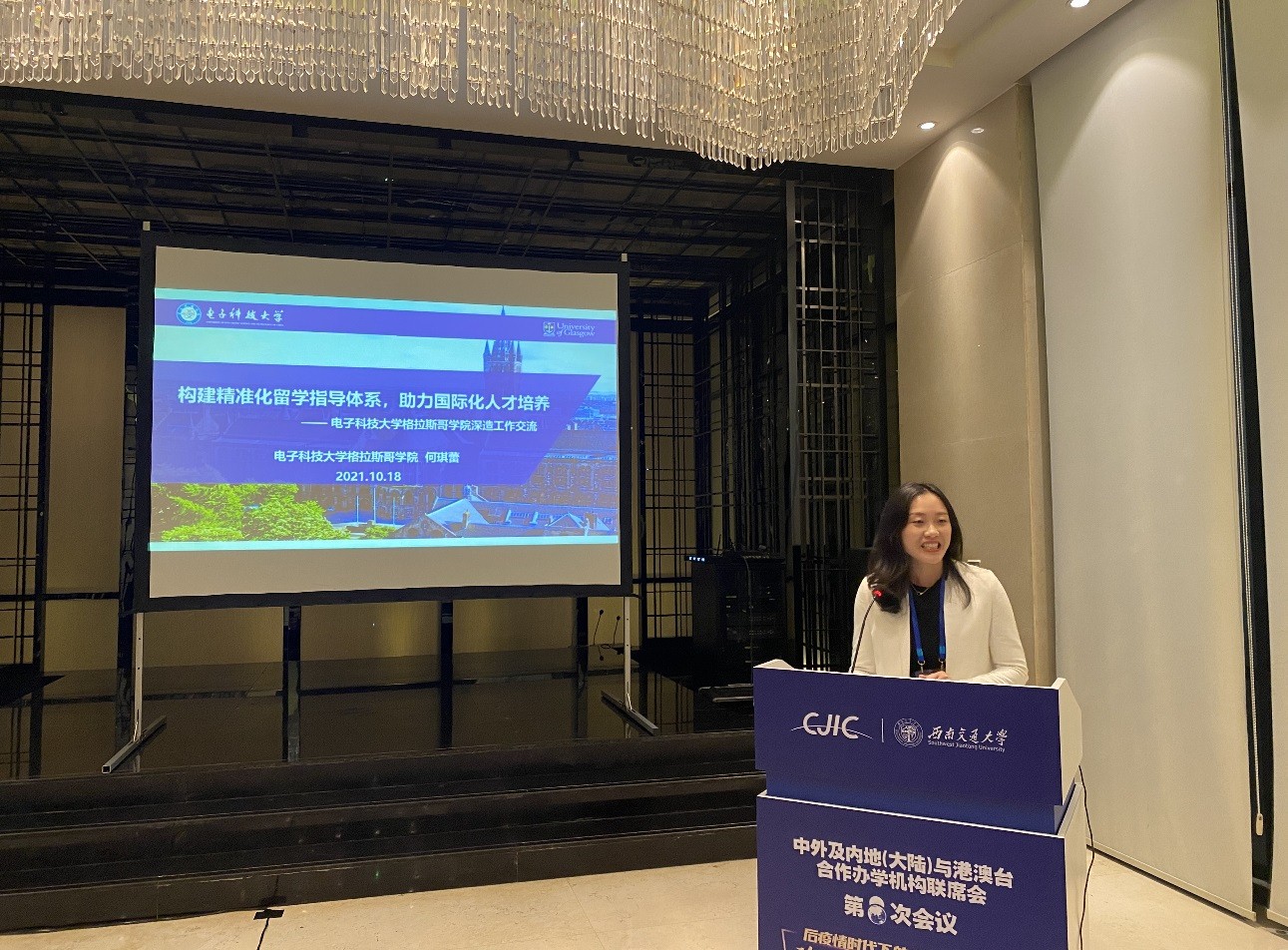 第二位发言嘉宾是电子科技大学格拉斯哥公司党总支副书记何琪蕾,发言主题为《构建精准化留学指导体系,助力国际化人才培养》。何琪蕾介绍了格拉斯哥学院的概况与毕业生深造情况概况,表示培养人才必须围绕中国情怀、国际视野,让员工讲好中国故事。