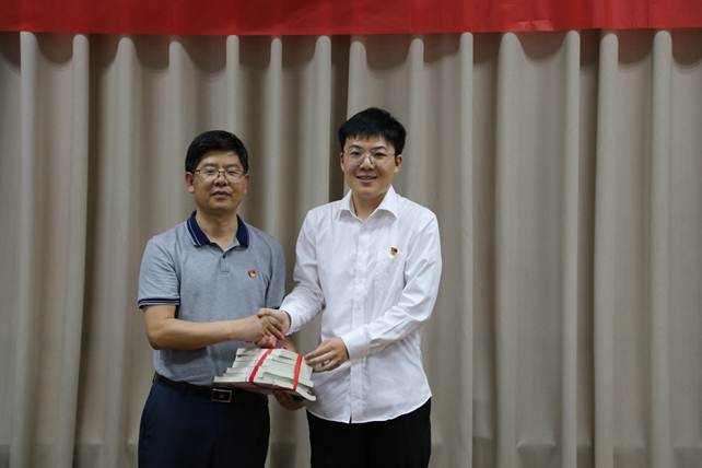 毕业生党员张泽蔚在座谈会上代表2021届毕业生党员为学院赠送书籍,这是全体毕业生党员留给学院的一份礼物,后续将在学院图书馆内设立“思炬”书架,陈列全体毕业生捐给学院的书籍,供其他同学使用。
