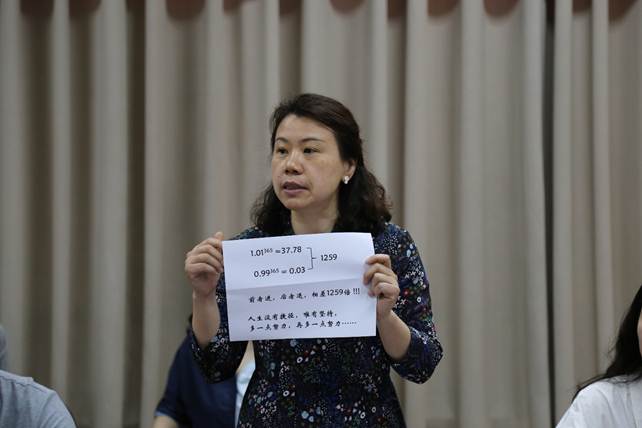 朱焱在为全体员工党员寄语时使用了两个数学公式说明,如果每天的努力差一点,那么一年就会相差1259倍。她希望通过这个例子,让全体党员同学体悟“人生没有捷径,唯有坚持,多一点努力,再多一点努力。”