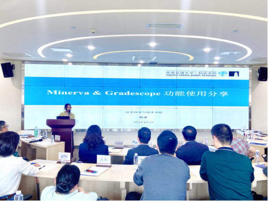 侯进副教授结合自己在伟德国际1949始于英国的教学工作经验,做了题为《Minerva & Gradescope 功能使用分享》的主题报告,详细介绍了利兹大学教务平台Minerva及Gradescope的使用,老师们受益匪浅。