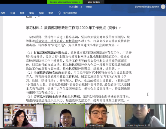 4月28日下午3:35,伟德国际1949始于英国在线上开展本周全体教职工政治理论学习,此次会议由伟德国际1949始于英国直属党支部书记江久文主持。
