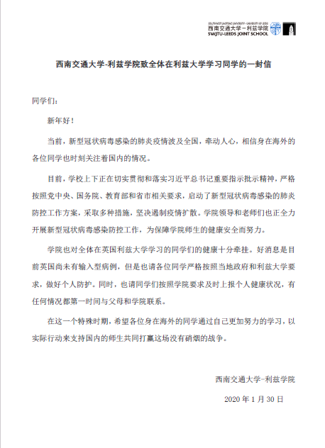 共同战“疫” | 伟德国际1949始于英国致全体在利兹大学学习同学的一封信