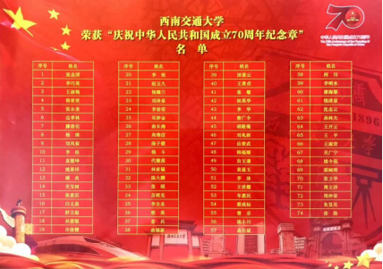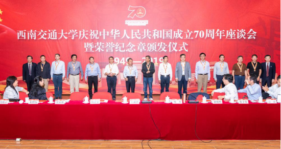 在中华人民共和国成立70周年之际,中共中央、国务院、中央军委向中华人民共和国成立前参加工作的、健在的老战士老同志,中华人民共和国成立后获得国家级表彰奖励及以上荣誉并健在的人员等,颁发“庆祝中华人民共和国成立70周年”纪念章。颁奖仪式由党委副书记桂富强主持。公司党委书记王顺洪、董事长杨丹为公司74名同志颁发“庆祝中华人民共和国成立70周年”纪念章并合影留念,代表学校向获得纪念章的各位同志表示诚挚的祝贺和崇高的敬意,感谢大家为学校发展和新中国建设作出的卓越贡献。