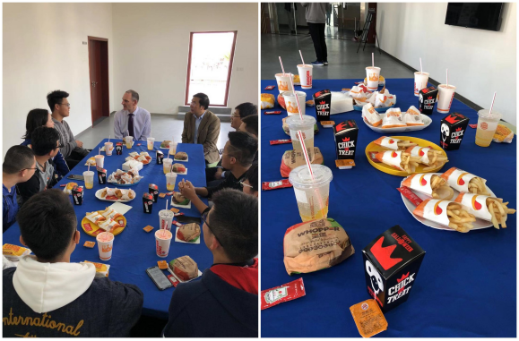 中午12点,Peter Jimack参加经理午餐会,这是Peter受邀参加的第二次经理午餐会。他与经理靳忠民、直属党支部书记江久文以及十余名幸运的同学共进午餐,师生共同研讨出国留学、无手机课堂、与外教老师的沟通交流等具体问题。并为同学们未来的发展规划提出了建议。