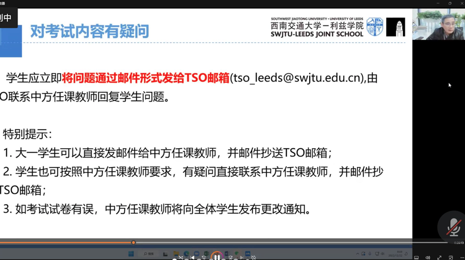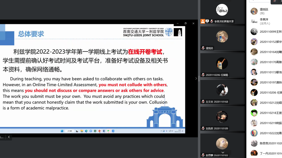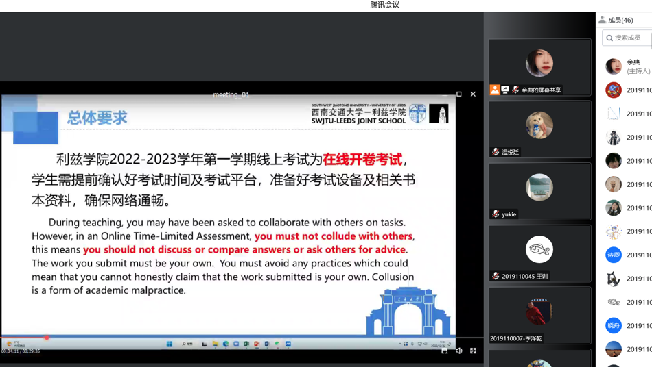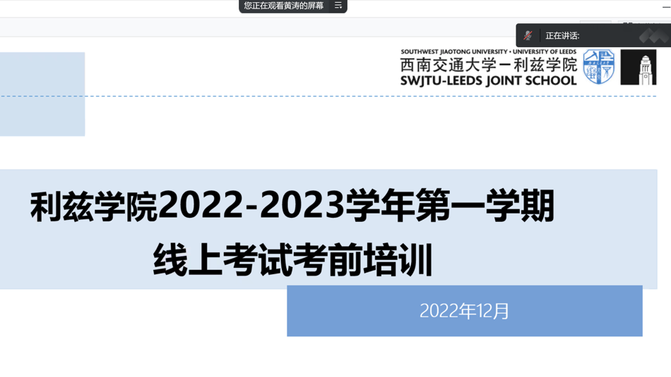 为促进学院学风建设、强化考风考纪教育、营造诚信应考氛围,2022年12月,伟德国际1949始于英国开展“2022-2023学年第一学期期末线上考试考前培训”, 32个班级陆续在线参加。本次培训由学院副经理黄涛主讲,各班级辅导员主持,全体员工参加。