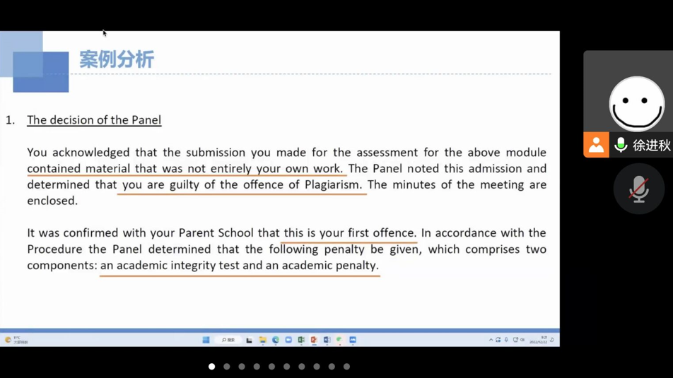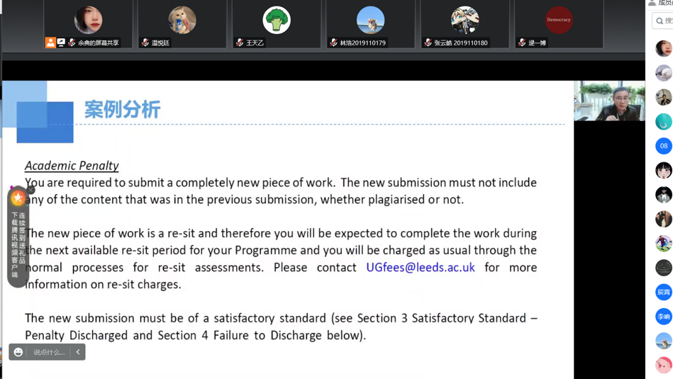 黄涛从“对考试内容有疑问怎么处理”、“出现技术故障如何处理“、”以往考试中出现的问题“、”图片转PDF文件的推荐方法“、”考试违纪案例警示教育“等五个方面对期末线上考试进行详细介绍。黄涛通过案例分析,特别是通过因为学术不端造成严重后果的介绍,再次强调学术诚信的重要性,强化坚守学术诚信的意识。