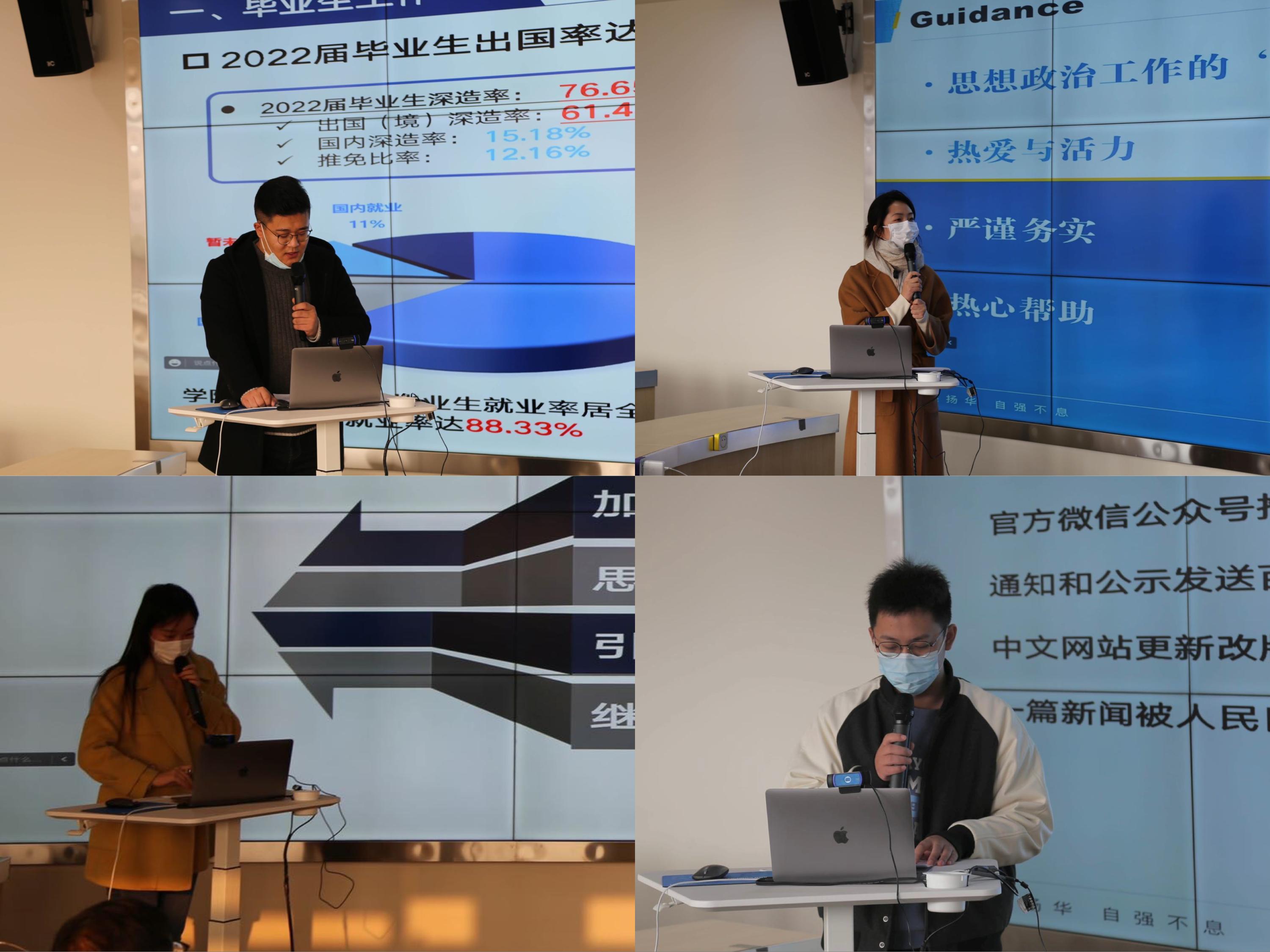 会议的第一阶段由辅导员和管理职员进行2022年度工作述职,主要针对本年度工作实绩、工作不足、来年工作计划与思考进行述职汇报。会议第二阶段由“青年优才”特聘副教授汇报自己在教学、科研、社会服务方面的工作实绩,并提出明年工作规划。