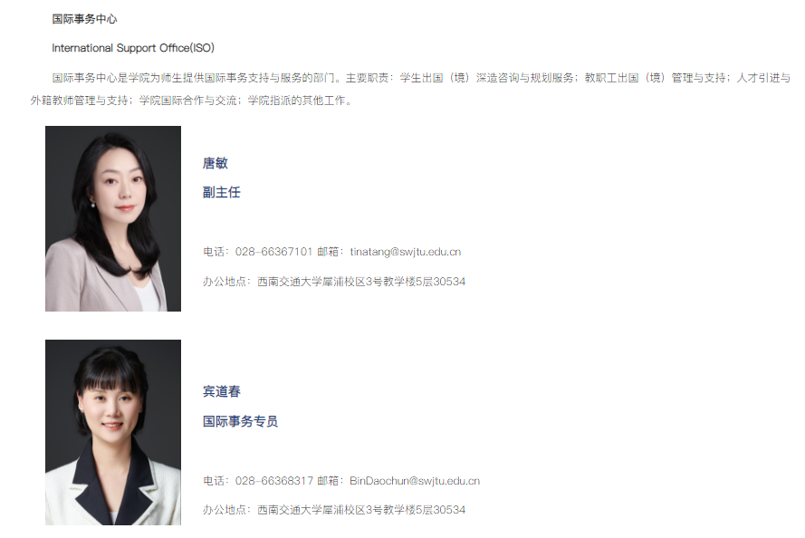 2022年9月,伟德国际1949始于英国正式成立国际事务中心(International Support Office,简称ISO)。该中心是学院为师生提供国际事务支持与服务的部门。主要职责为:员工出国(境)深造咨询与规划服务;教职工出国(境)管理与支持;人才引进与外籍教师管理与支持;学院国际合作与交流;学院指派的其他工作。目前国际事务中心共有两名成员,由唐敏担任国际事务中心副主任,宾道春担任国际事务专员。