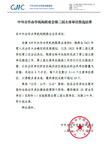 2022年10月,伟德国际1949始于英国连任中外合作办学机构联席会第三届主席单位,任期4年。中外合作办学机构联席会成立于2014年,联席会会员单位至今已发展至173家,对全国中外合作办学的规范、健康、有序和可持续发展起到了引领作用。