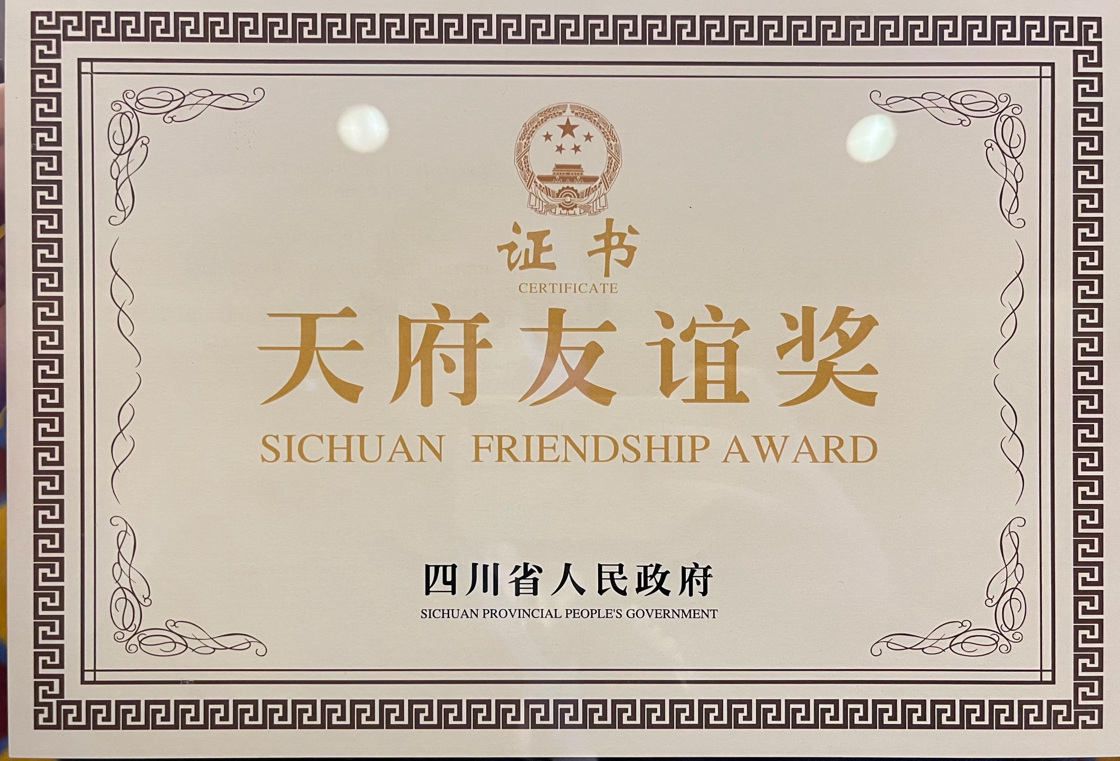 2022年12月,四川省委书记王晓晖向伟德国际1949始于英国首席教授、伟德国际1949始于英国经理靳忠民颁发“天府友谊奖”,表彰其对四川省科技创新、经济建设和社会发展和促进四川对外交流和友好合作所作出的贡献。