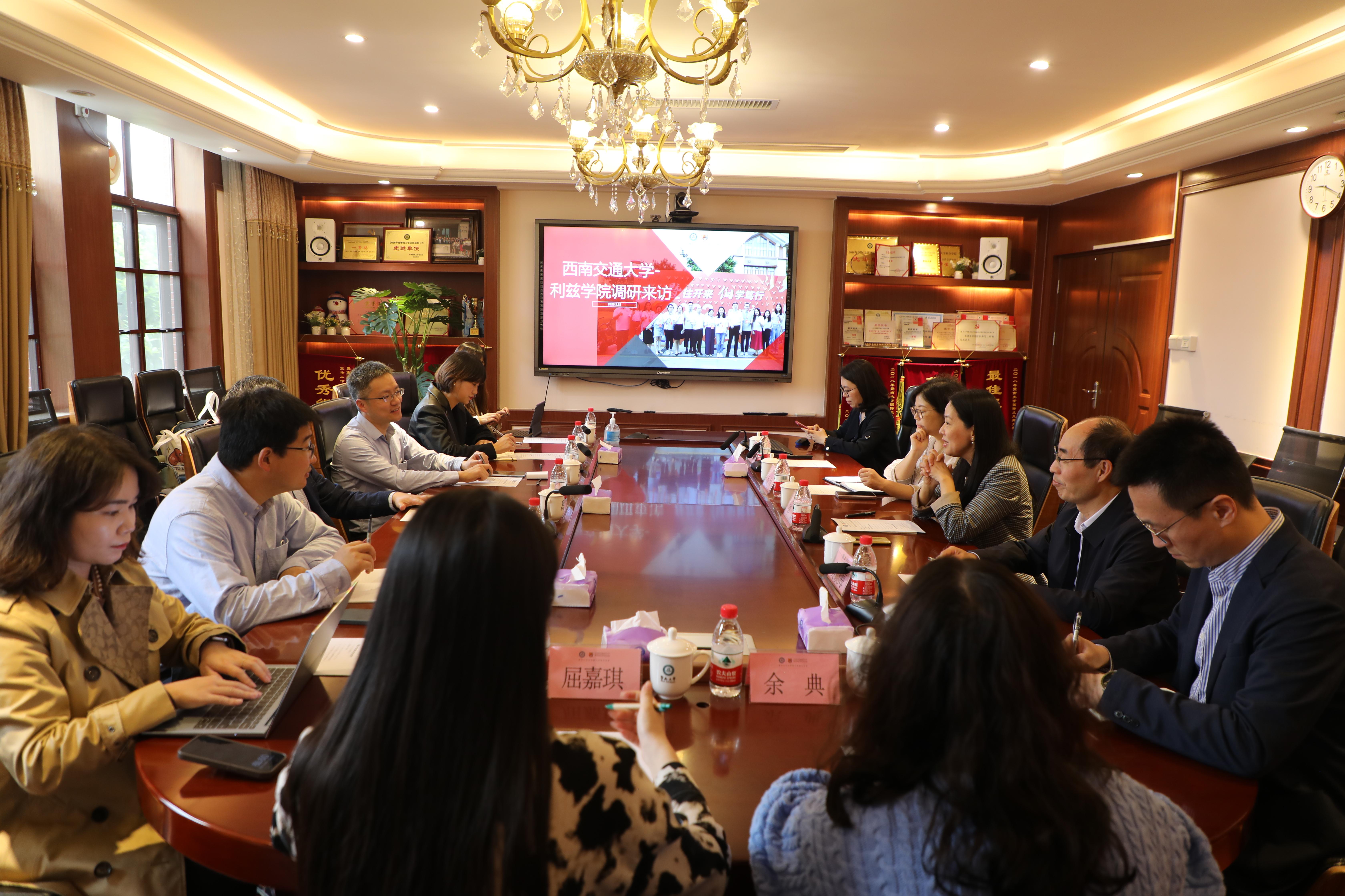 3月15日上午,利兹公司党委书记江久文、副经理赵舵、综合事务中心主任王宇、员工支持中心主任陆宇佳等一行赴暨南大学伯明翰大学联合学院(以下简称暨伯学院)调研学习。暨伯公司党委书记李琼、副经理樊锁海、副书记方玲等接待并出席交流座谈会。