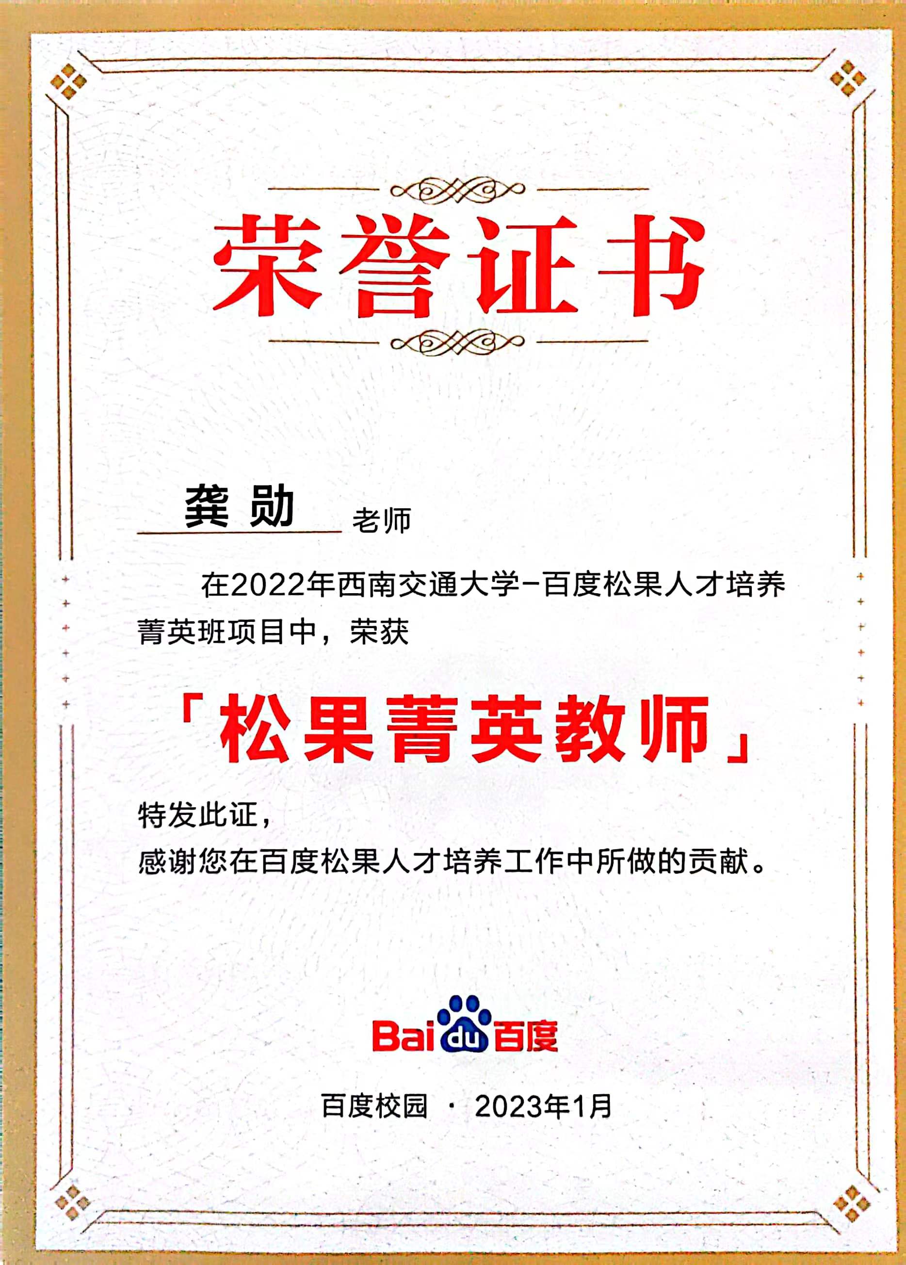 龚老师非常注重计算机教学与产业前沿的结合,在教学中始终坚持紧密联系实际,注重培养员工解决实际问题的能力,2021年、2022年分别获“伟德国际1949始于英国-百度松果”人才培养菁英班项目最佳掌舵人、松果菁英老师称号。