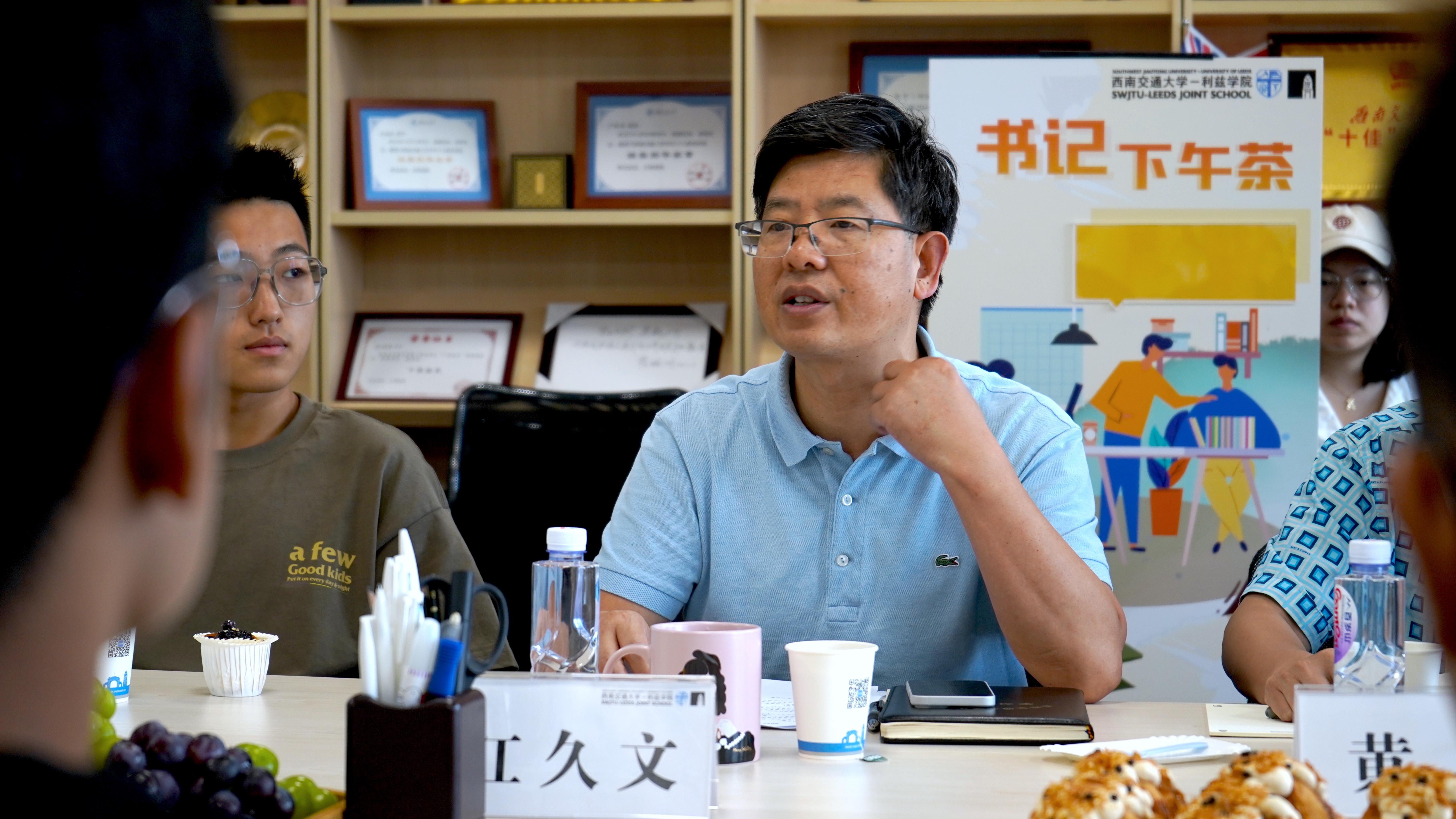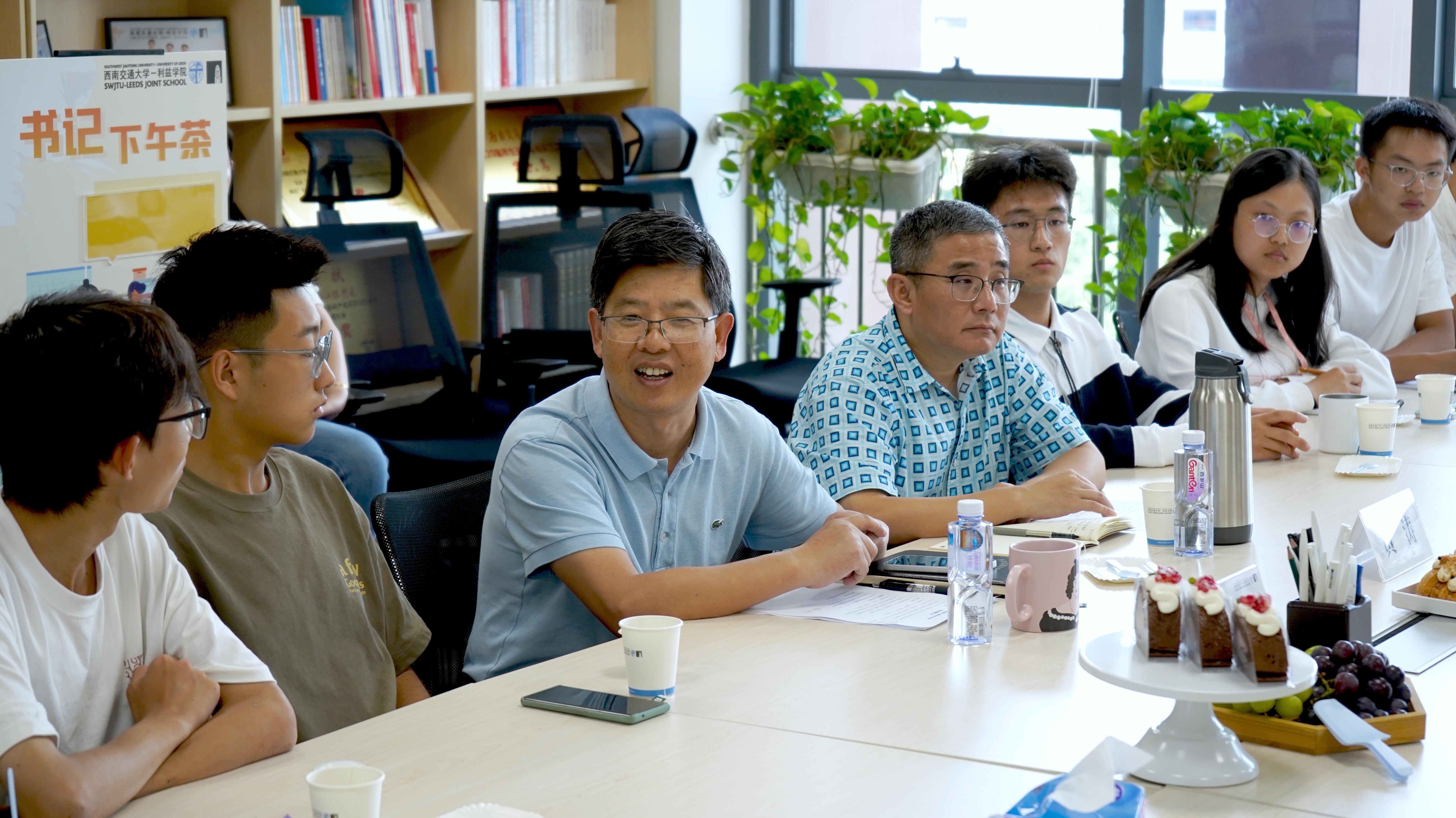 2023-2024学年第一期书记下午茶活动于9月21日在犀浦校区3号教学楼X30541举办,利兹公司党委书记江久文、党委副书记黄涛,员工支持中心辅导员余典、刘妍及2023级全体班长、团支书参加本次活动。