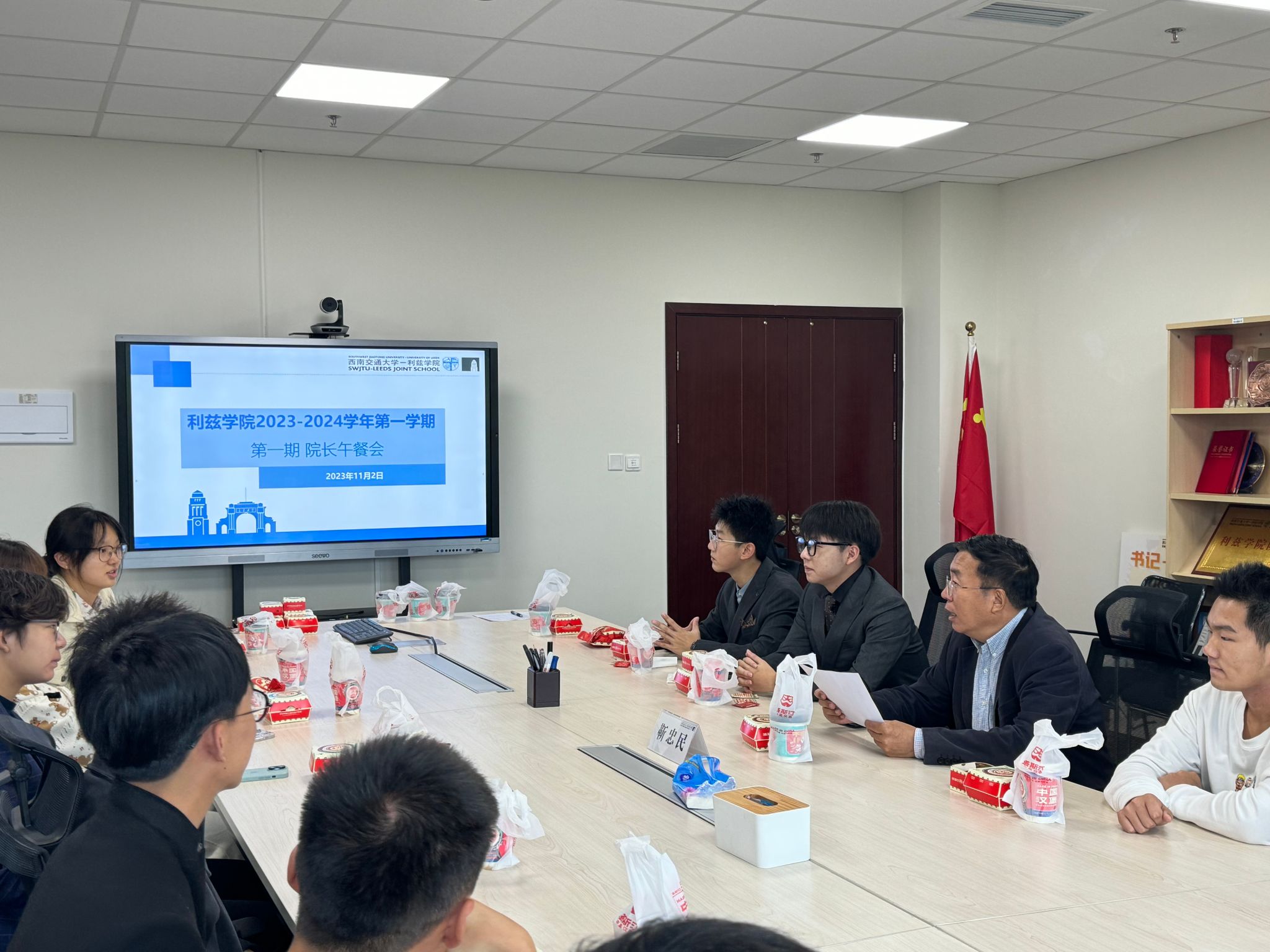11月2日中午,2023-2024学年第一期经理午餐会在犀浦校区X30541举行。伟德国际1949始于英国经理靳忠民,2023级辅导员余典、刘妍及16名来自2023级5个专业的新生代表参加本次活动。